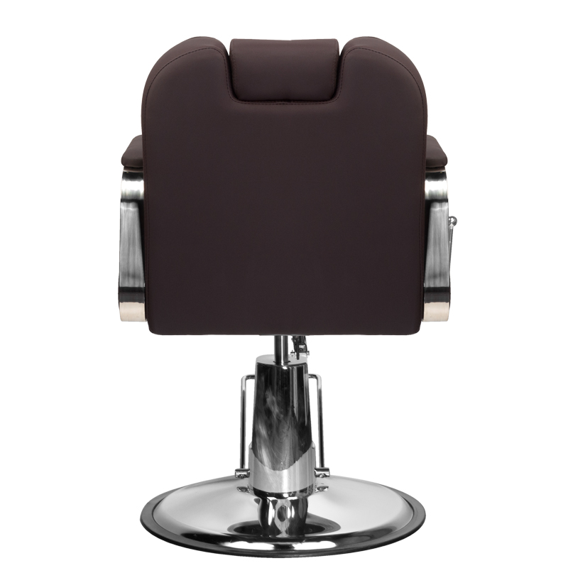 Stabilna podstawa w odcieniach chromu zapewnia pewne podparcie i wysoki komfort użytkowania. Wypełnienie z odpornej na odkształcenia pianki oraz obicie z przyjemnej w dotyku skóry syntetycznej zapewniają trwałość i komfortowe użytkowanie mebla przez długi czas. Materiały odporne na wilgoć i łatwe w czyszczeniu sprawiają, że fotel doskonale sprawdza się w codziennej pracy. Odcienie brązu, eleganckie przeszycia oraz chromowane detale nadają mu wyjątkowego charakteru, doskonale komponując się z wystrojem salonów barberskich.