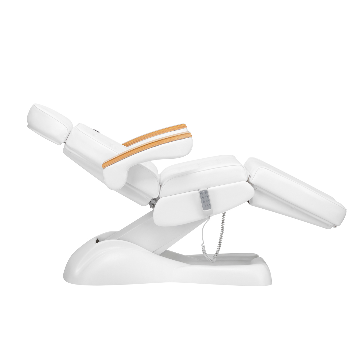 Fotel wypełniony jest pianką o odpowiedniej twardości, a jego powierzchnia pokryta jest przyjemną w dotyku imitacją skóry w odcieniach bieli. Materiał, z którego wykonano pokrycie, jest łatwy do utrzymania w czystości oraz odporny na wybrane środki dezynfekcyjne, co gwarantuje komfort użytkowania i trwałość na wilgoć. Solidna podstawa wykonana z trwałego materiału w odcieniach bieli zapewnia stabilność w trakcie zabiegów. Ozdobne drewniane elementy na podłokietnikach wyróżniają fotel, stanowiąc elegancki akcent, który przyciąga wzrok. Starannie wyprofilowane, ergonomiczne obszycia nadają fotelowi stylowy wygląd, jednocześnie zapewniając wygodę.