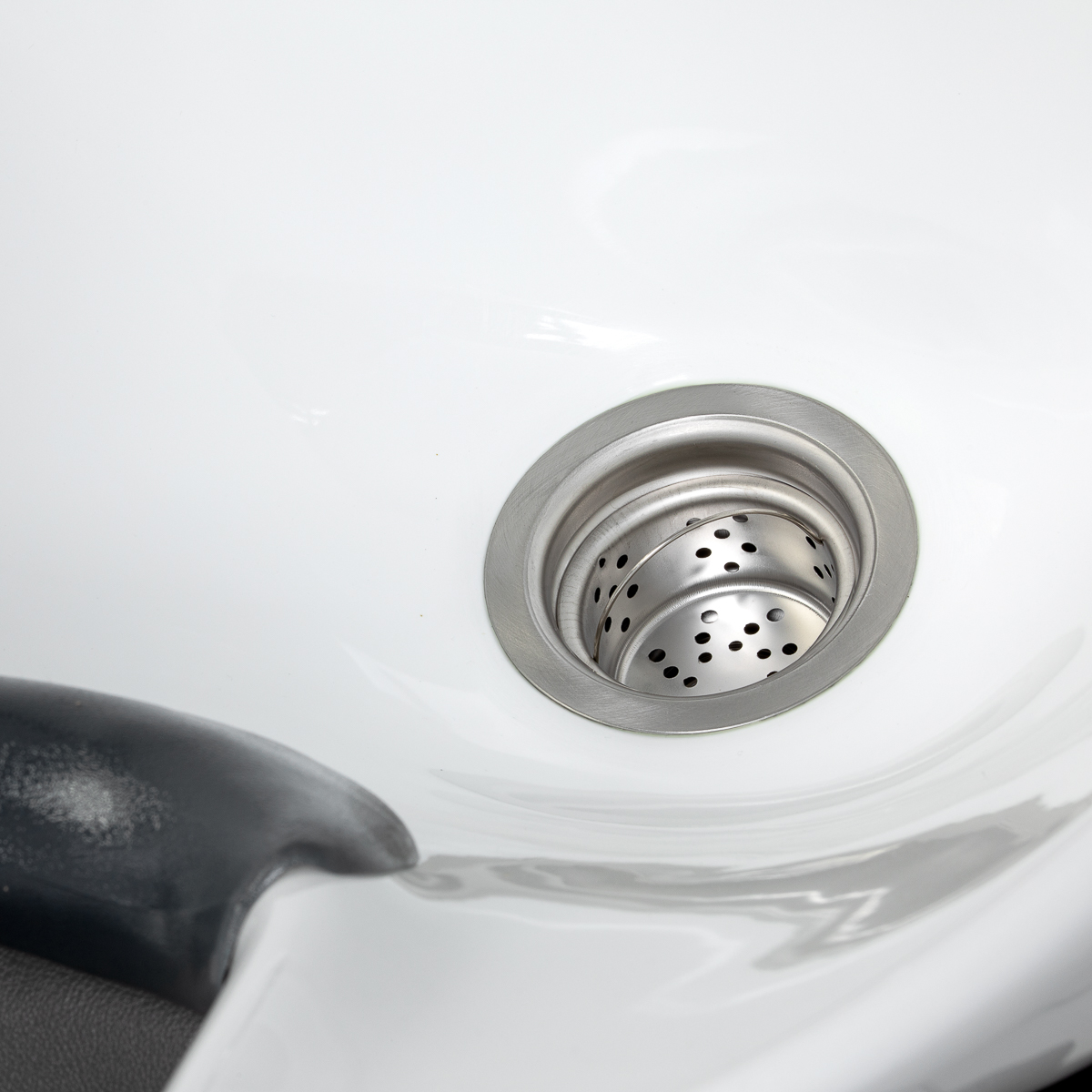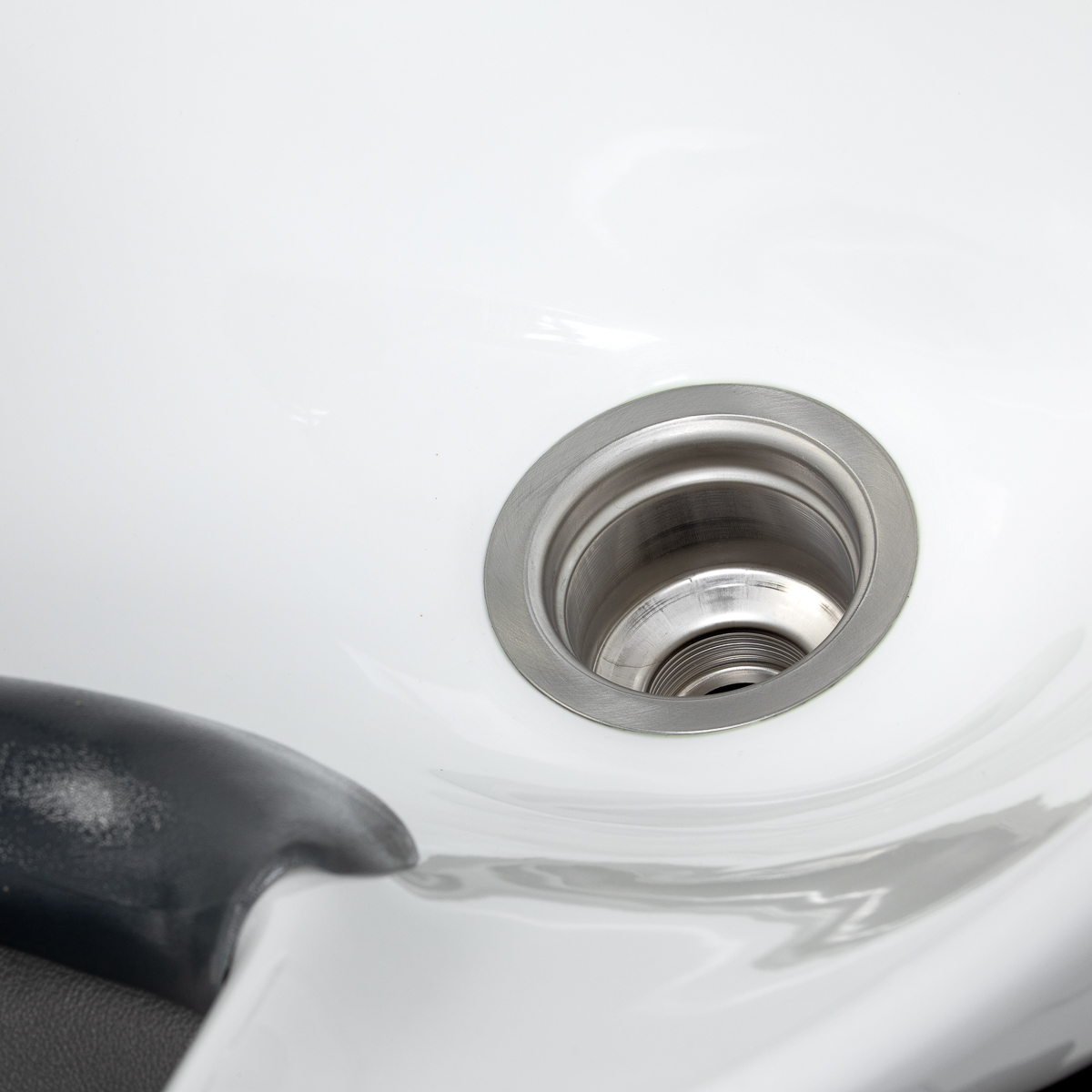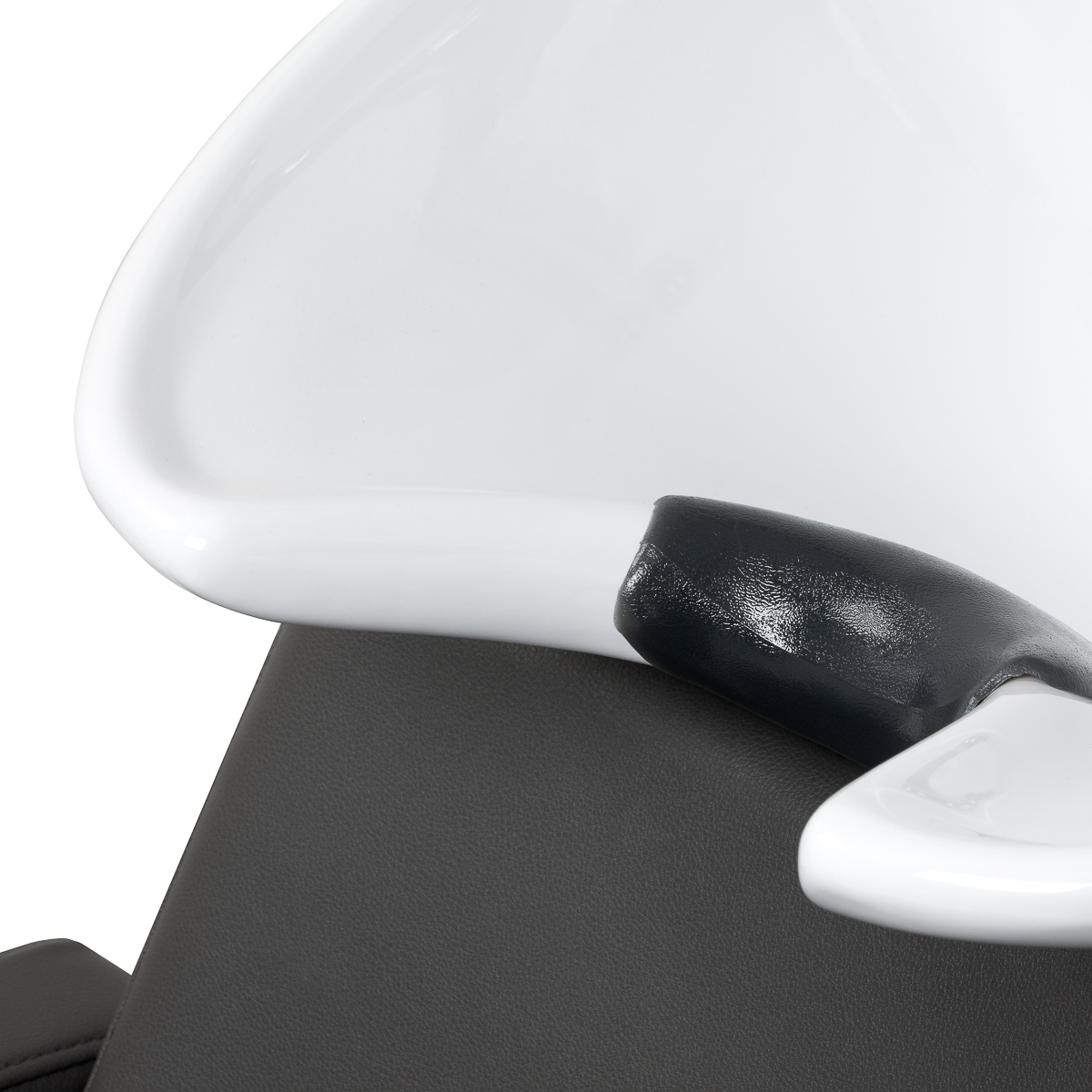 Głęboka ceramiczna misa w odcieniach bieli skutecznie ogranicza rozchlapywanie wody oraz preparatów używanych podczas zabiegów. Sprzyja to komfortowemu i precyzyjnemu wykonywaniu różnorodnych usług fryzjerskich. Ruchoma konstrukcja misy pozwala na łatwe dopasowanie kąta nachylenia do indywidualnych potrzeb. Zastosowany materiał jest trwały, odporny na przebarwienia i zarysowania, a także łatwy w utrzymaniu czystości. Odpowiednio wyprofilowany kołnierz zapewnia wygodne podparcie głowy podczas mycia, natomiast komfortowa nakładka z tworzywa sztucznego w odcieniach czerni eliminuje uczucie chłodu ceramicznej powierzchni.